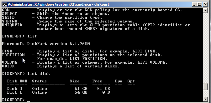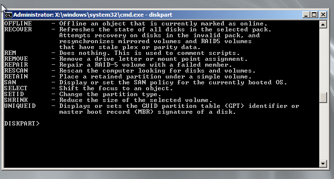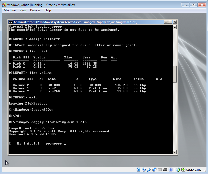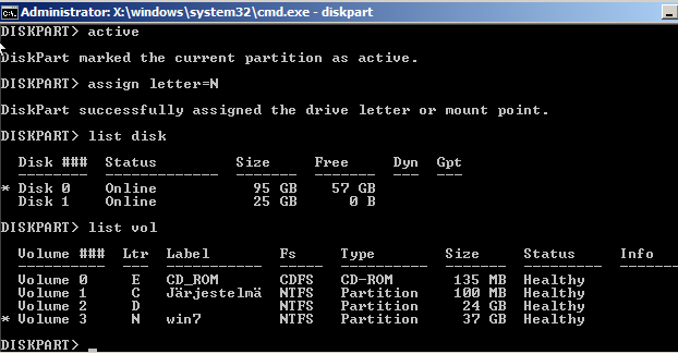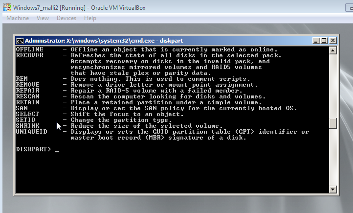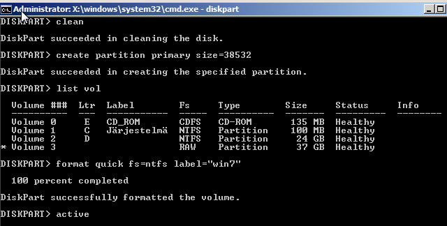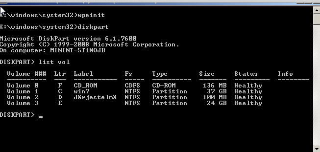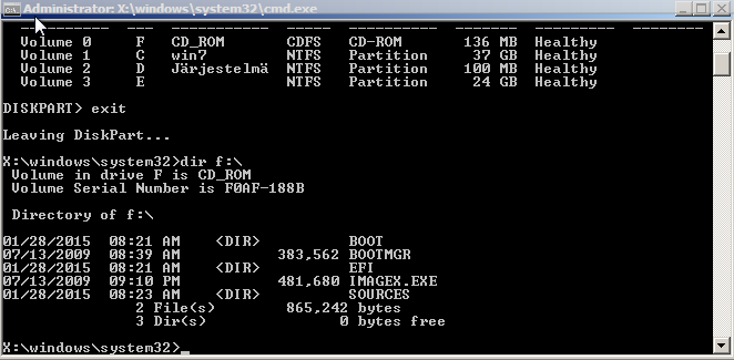 Tämän jälkeen avasin mallikoneen cd/dvd asemalta ja sain mustan laatikon. Yeah. Toivottavasti oikea. Sain komennolla diskpart jotain aikaiseksi.