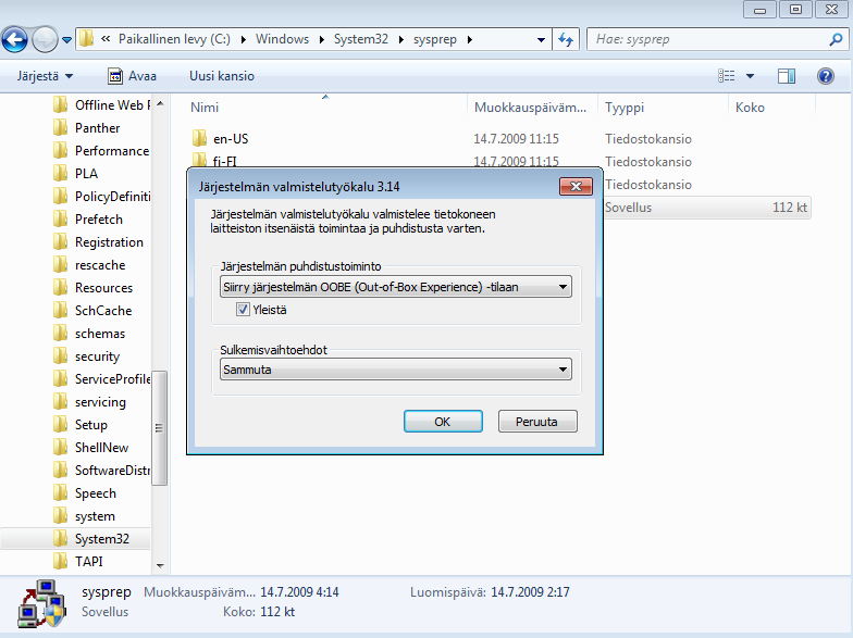 Vihdoinkin pääsin syspreppaamaan koneen. Polku olikin tuolla aikaisemmassa kirjoituksessa. Tokihan tuossa painetaan syspreppiä. Kone sammutetaan ja laitetaan ruksi kohtaan yleistä.