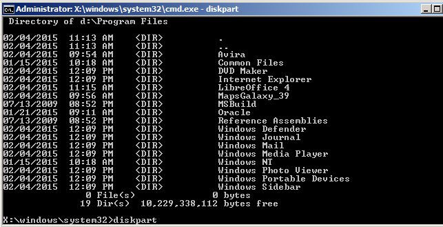 Komennolla dir d:\program Files näkyy ohjelmat mitä levyllä d on eli minun asentamani Libre Office, Avira jne.