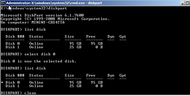 Tässä katsotaan vielä levyt ja valitaan levy 0 eli select disk 0. Valittuun tulee tähti.