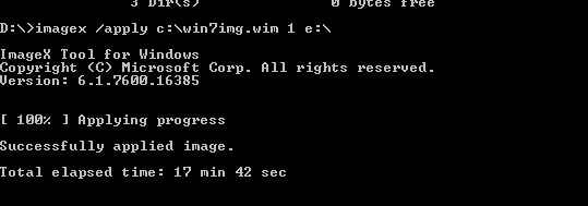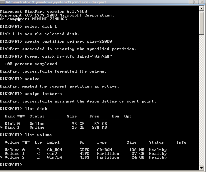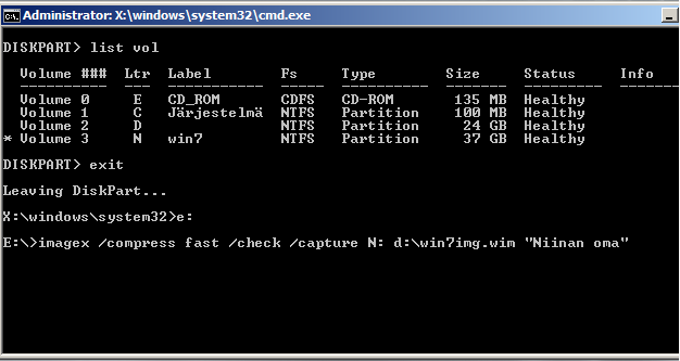 Loin uuden kohdekoneen isommalla kovalevyllä ja tein uudelleen imagen luomisen kohdekoneelle. Levyn 1 partitiointi koolle 25 000, formatoiminen ja nimeäminen Win7LA:ksi ja käyttää tunnusta e: