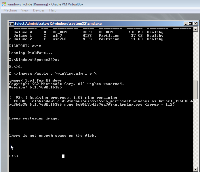 Ensimmäinen imagen siirto ei onnistunut kohdekoneelle koska tila loppui kesken Volume 2:lta E-levyltä: